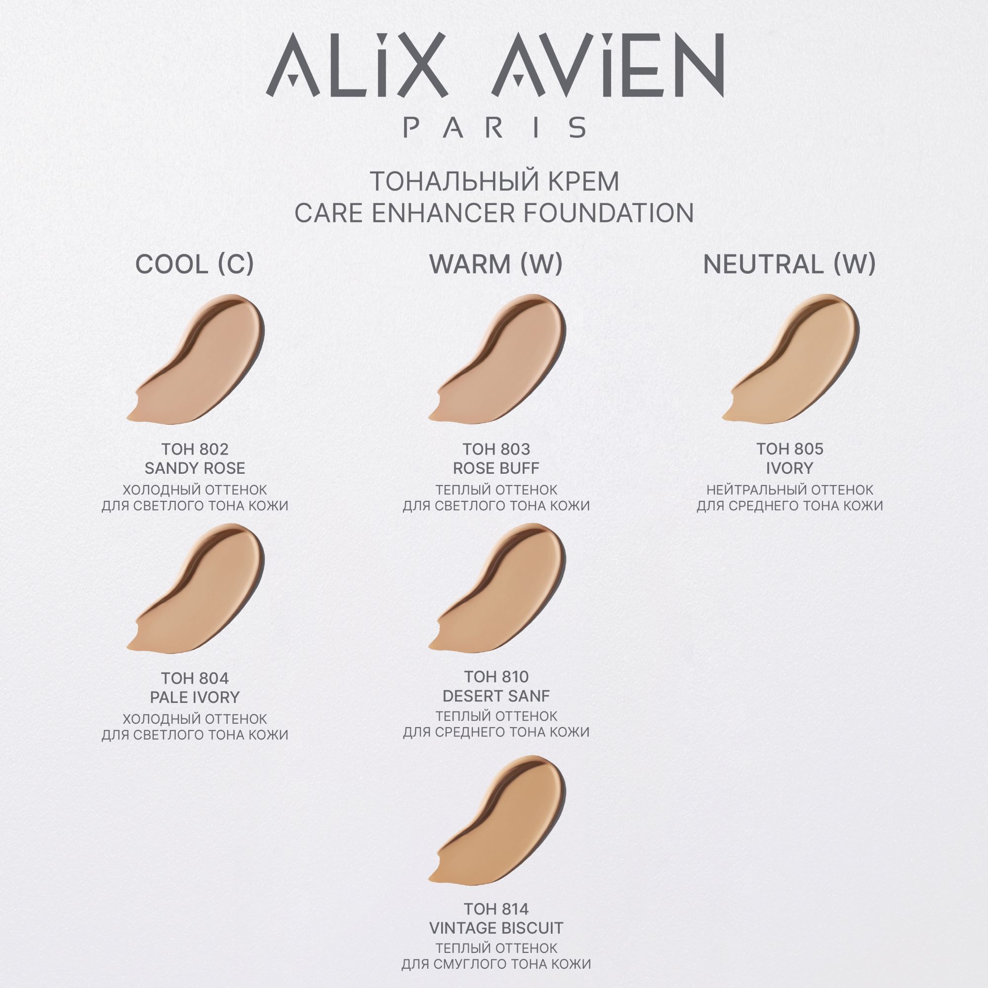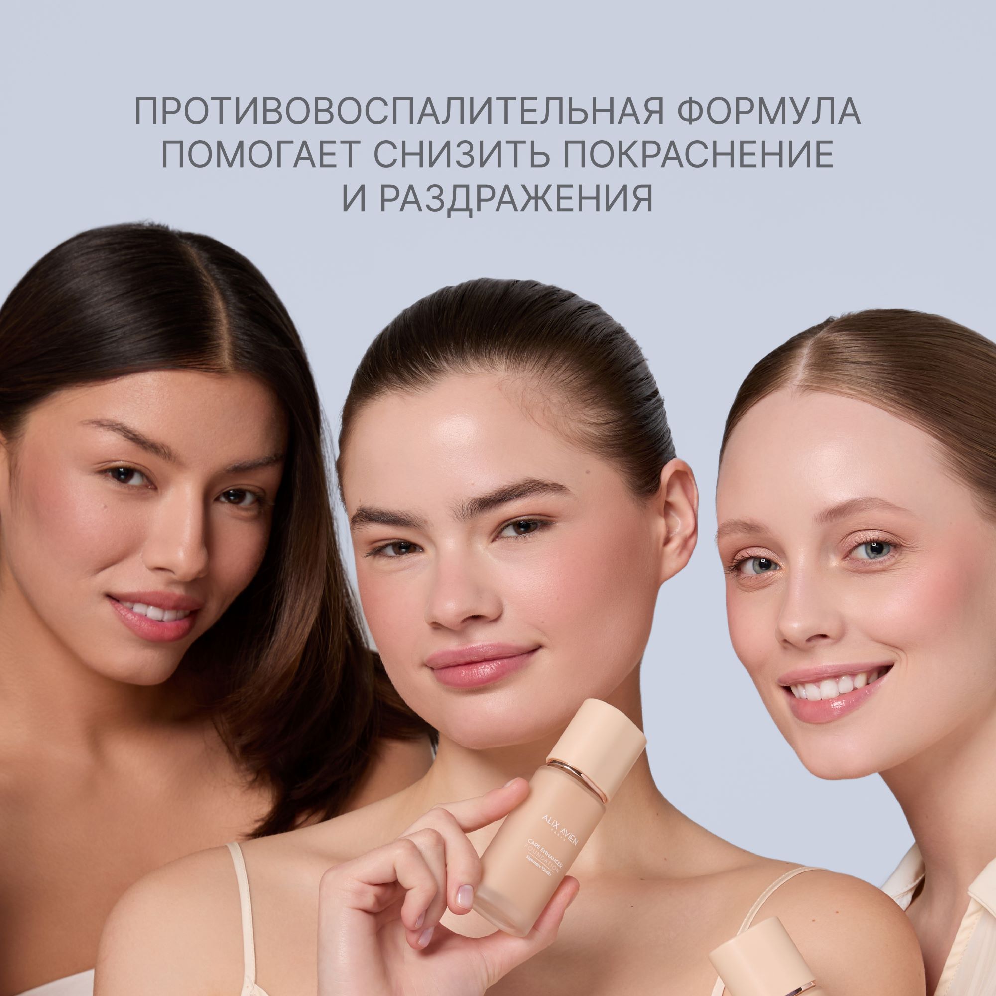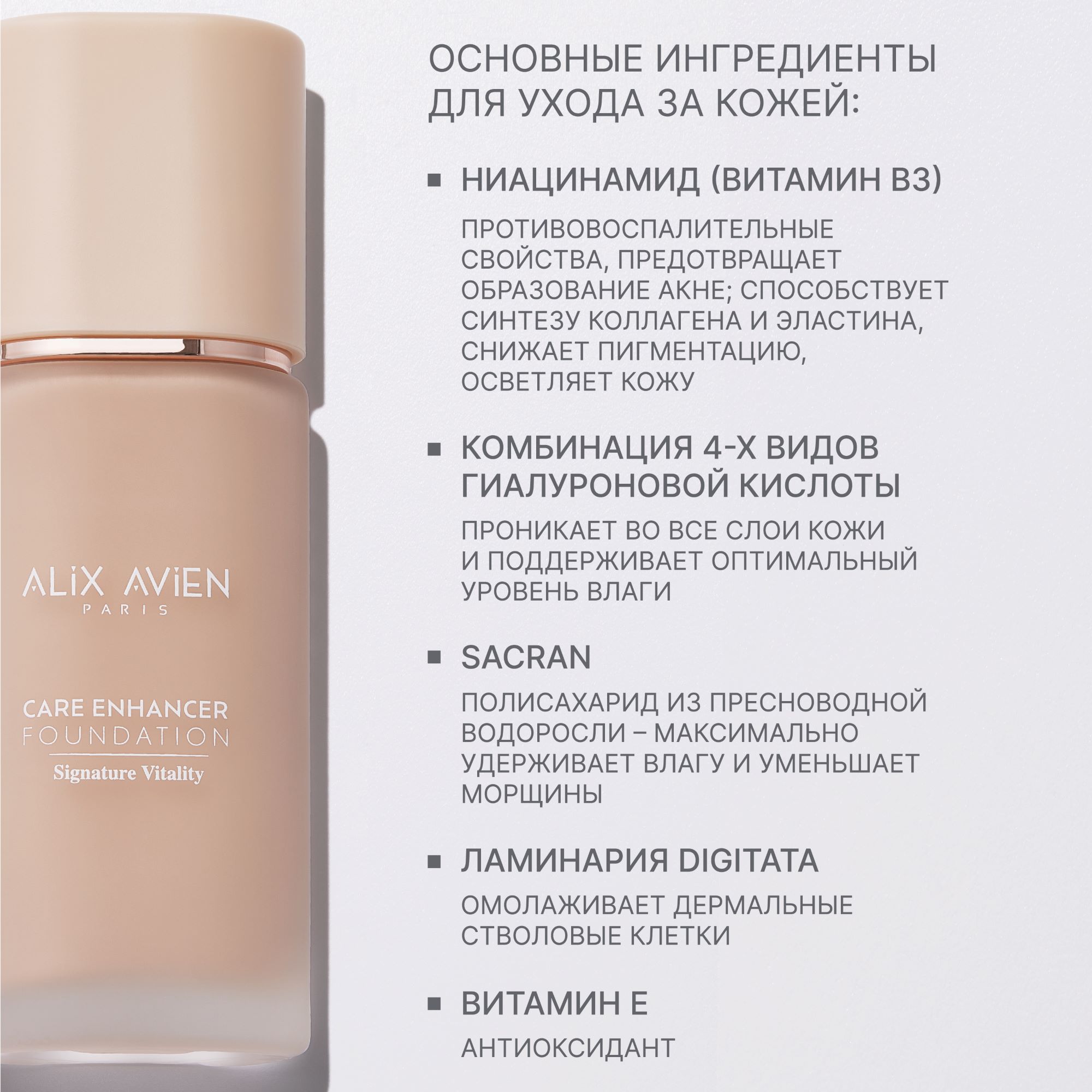 Наша формула включает секреты профессионального макияжа. Натуральный состав обеспечит вашему лицу необходимое увлажнение и уход. Гиалурон и коллаген поддержат молодость кожи, сняв воспаление и предотвратив появление морщин. Ниацинамид помогает улучшить текстуру кожи, а водоросли Нори способствуют борьбе с пигментацией. Косметика тщательно создана не только для женщин, заботящихся о красоте, но и желающих сохранить здоровье кожи. Формула подстраивается под любой тон лица благодаря своему уникальному составу. Декоративная косметика женская ALIX AVIEN обеспечит ухоженный вид в любой ситуации. Это не просто стойкий тональник - а полноценный уход за лицом.